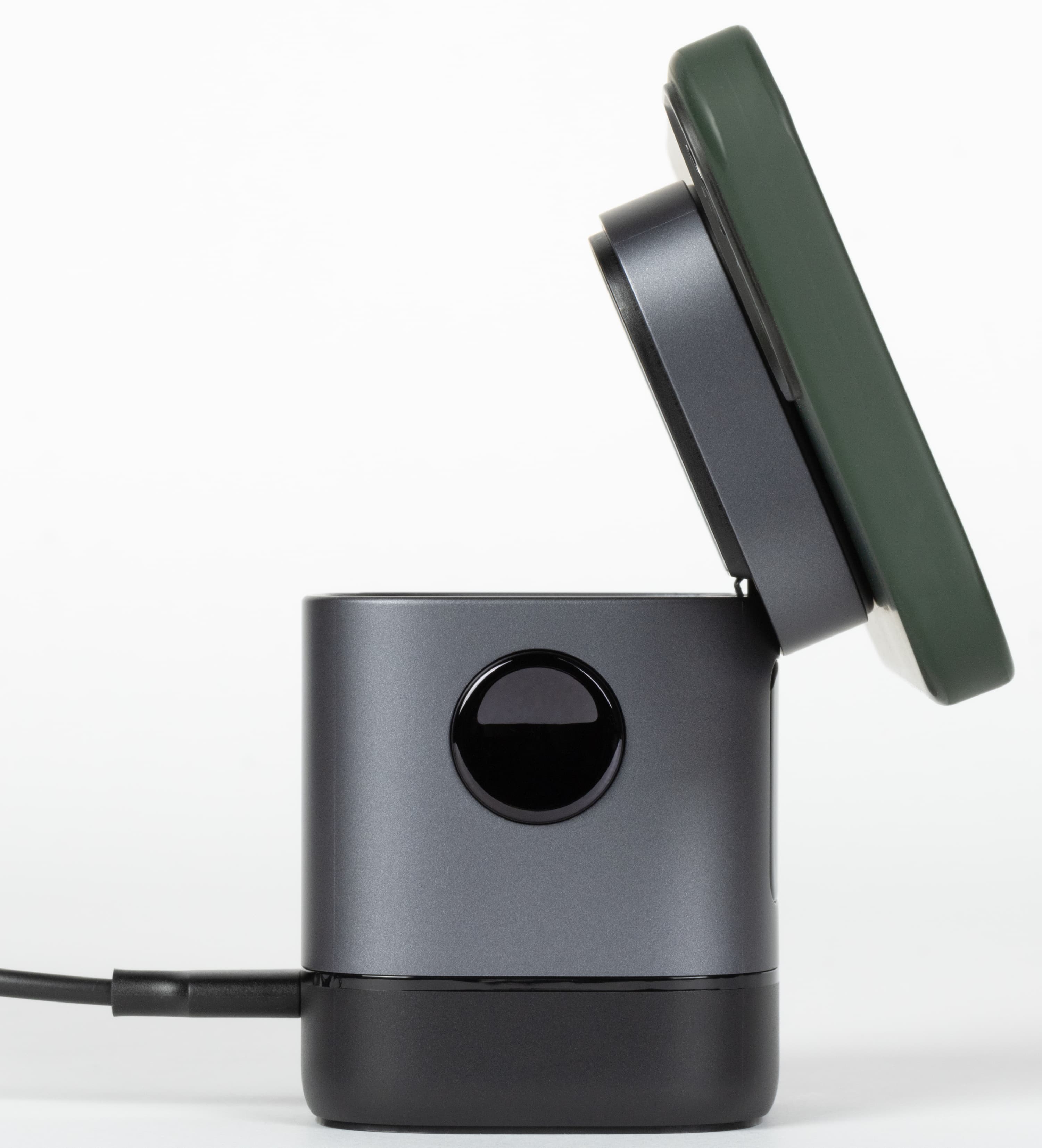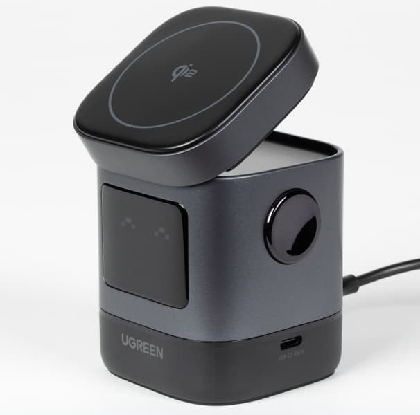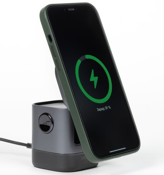 В верхней части толщиной около полутора сантиметров находится поверхность взаимодействия базовой станции Qi2, на ней обозначена окружность, соответствующая расположению катушки, и имеется значок «Qi2», свидетельствующий о соответствующей сертификации в WPC. Там же имеются сильные магниты, обеспечивающие удержание и правильное позиционирование при беспроводном заряде устройств, поддерживающих Qi2. Ее можно откинуть на угол до 70 градусов от горизонтали, причем петля достаточно тугая — заданное положение сохранится при установке смартфона и манипуляциях с ним.