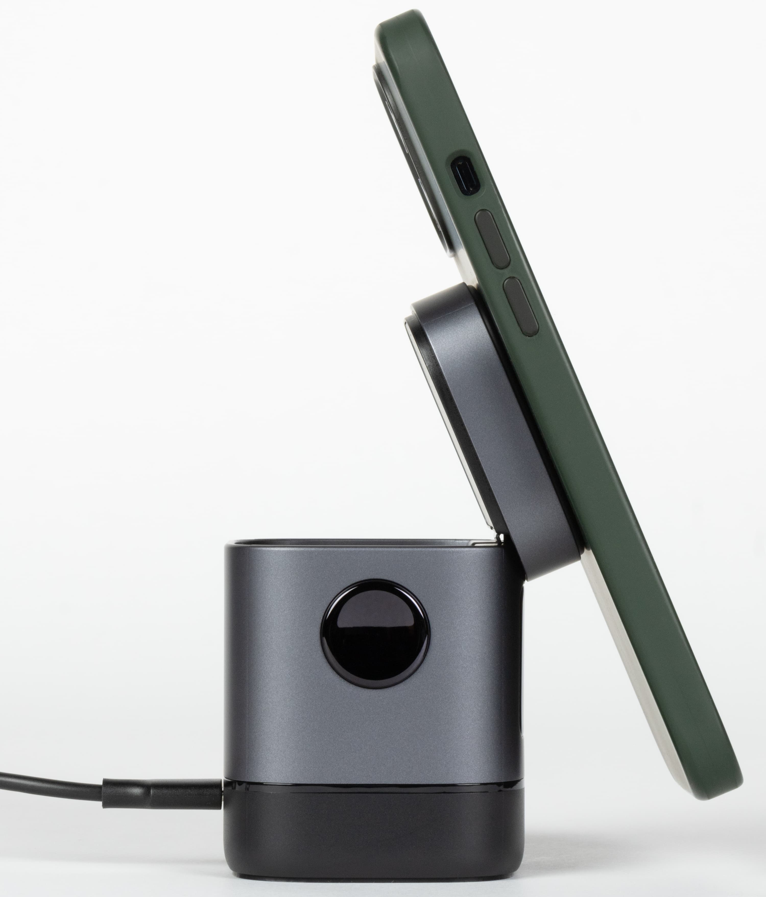 При откинутой верхней части становится доступной вторая поверхность взаимодействия, на этот раз Qi без магнитов, куда можно уложить кейс Bluetooth-наушников, поддерживающий беспроводную зарядку. Предусмотрены невысокие бортики, предотвращающие выпадение этого кейса при случайном толчке, но ограничивающие размеры укладываемого устройства.