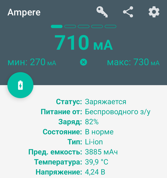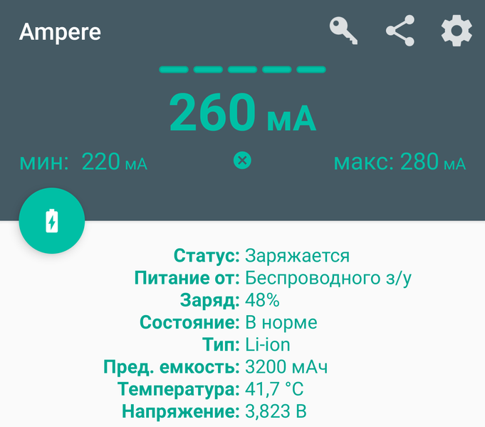 Задействуется 9-вольтовый режим, потребляемый смартфоном ток в начале процесса достигает 1,2-1,3 А, при этом приложение Ampere показывает, что аккумулятор заряжается током около 2,4 ампера (начинает понемногу снижаться лишь через 40-45 минут); температура была чуть меньше, чем при беспроводной зарядке — в пределах 41 °C.