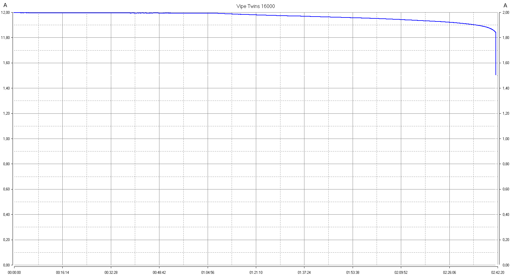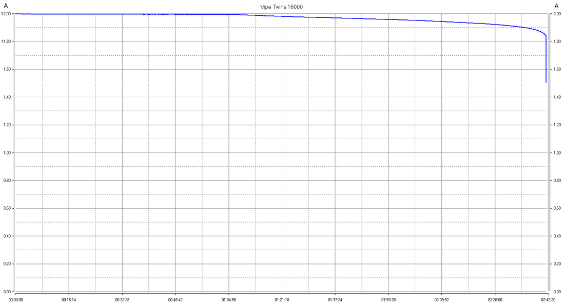 | PD 12 В | 1,5 А | 12,0 В | медленно снижается | 11,0 В | 2 часа 42 минуты | 47,2 Вт·ч | 80% |