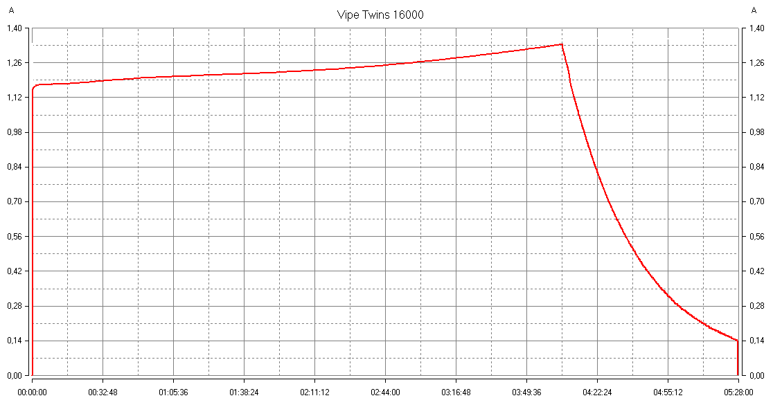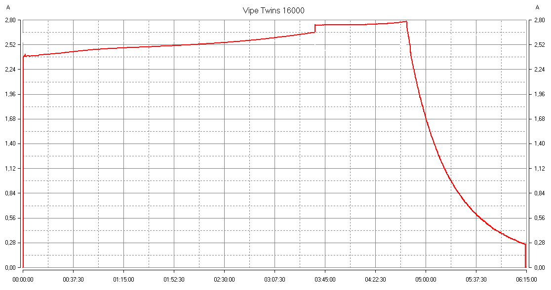 Максимум тока даже несколько превосходит заявленный — около 2,8 А вместо 2,6 А, но время все равно получилось существенно больше, чем в спецификации: в среднем 6 часов 20 минут.