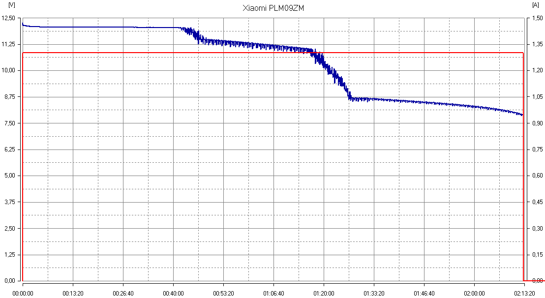Выходное напряжение остается на уровне 12,0 В немного более 40 минут (треть общего времени), затем следует быстрый спад на 0,6-0,7 В с последующим медленным уменьшением. Еще через 40 минут новый спад, более существенный: примерно на 2,5 В, затем опять медленное уменьшение. В конце напряжение на выходе оказывается на уровне 7,8-7,9 В. До отключения прошло 2 часа 13 минут.