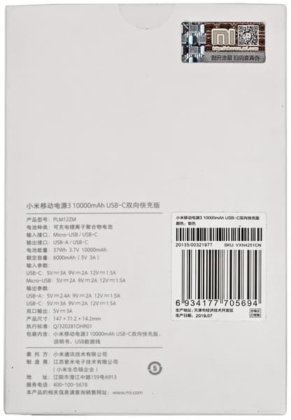 Mi Power Bank 3 10000 (PLM12ZM) — аппарат с вполне современным набором поддерживаемых режимов и технологий, включая Quick Charge и Power Delivery, причем как для выходов, так и для входов. Входов два — широко распространенный Micro-USB, а также Type-C, который может быть и выходом.