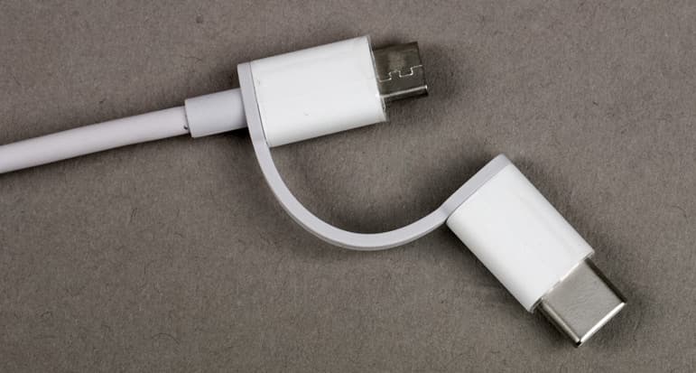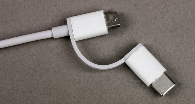 В комплекте имеется кабель длиной 30 см от разъема до разъема, круглого сечения и довольно жесткий. Он оснащен разъемами USB и Micro-USB, для последнего имеется переходник на Type-C, прикрепленный с помощью гибкого поводка, чтобы не потерялся.