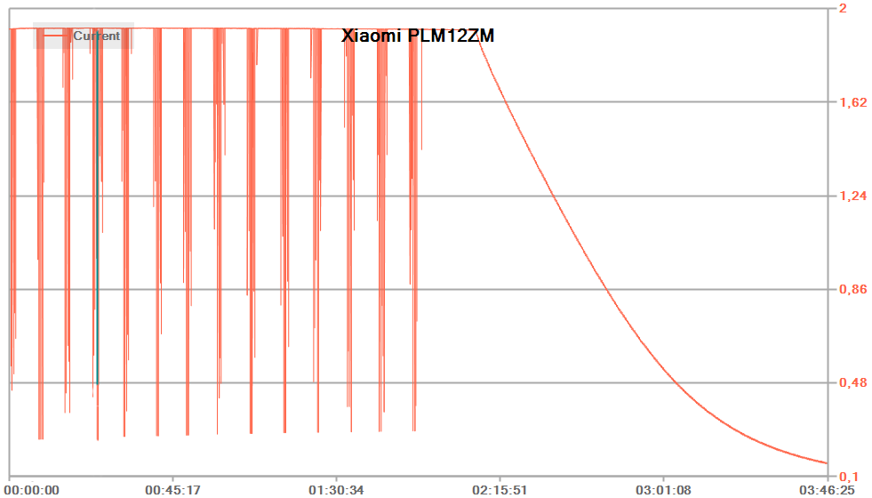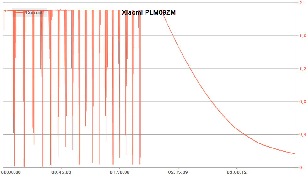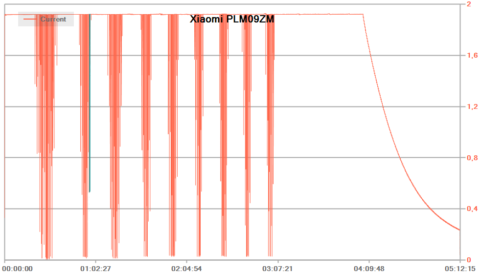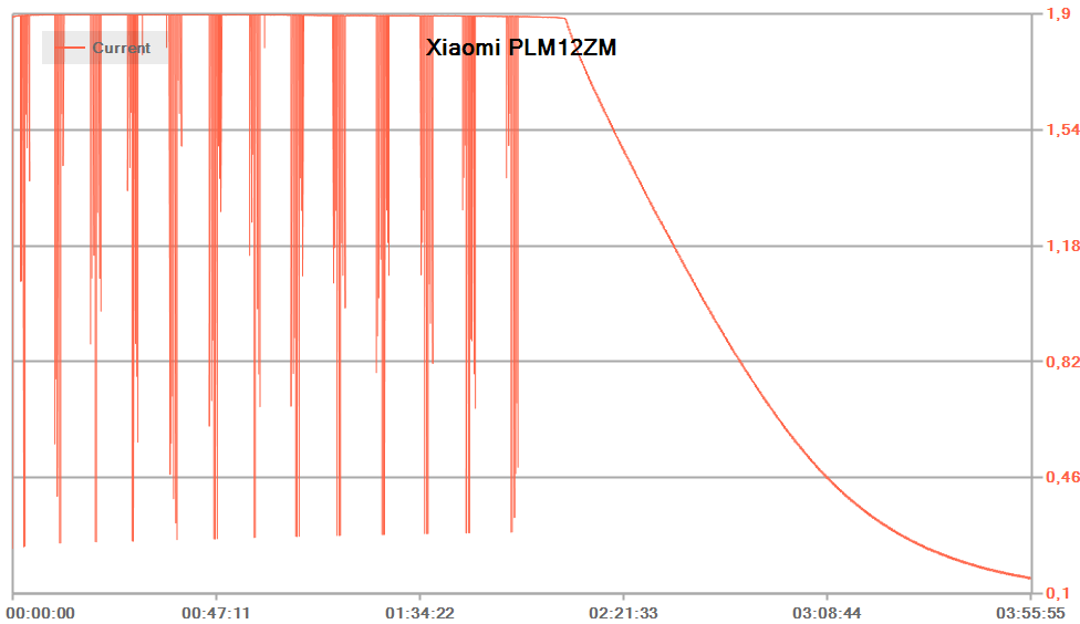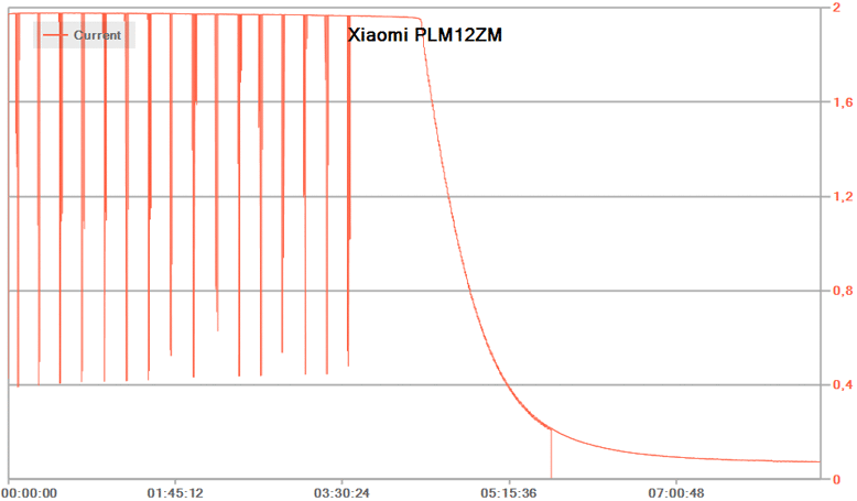 При подключении к обычному ЗУ с предельным током 2,4 А (реальным, а не декларируемым) максимальное потребление составило 1,9 А при заявленном максимуме 2 А, алгоритм в целом соответствует типовому для литий-ионных батарей: сначала заряд постоянным током, затем падающим током при постоянном напряжении. Но сам график не идеальный:
