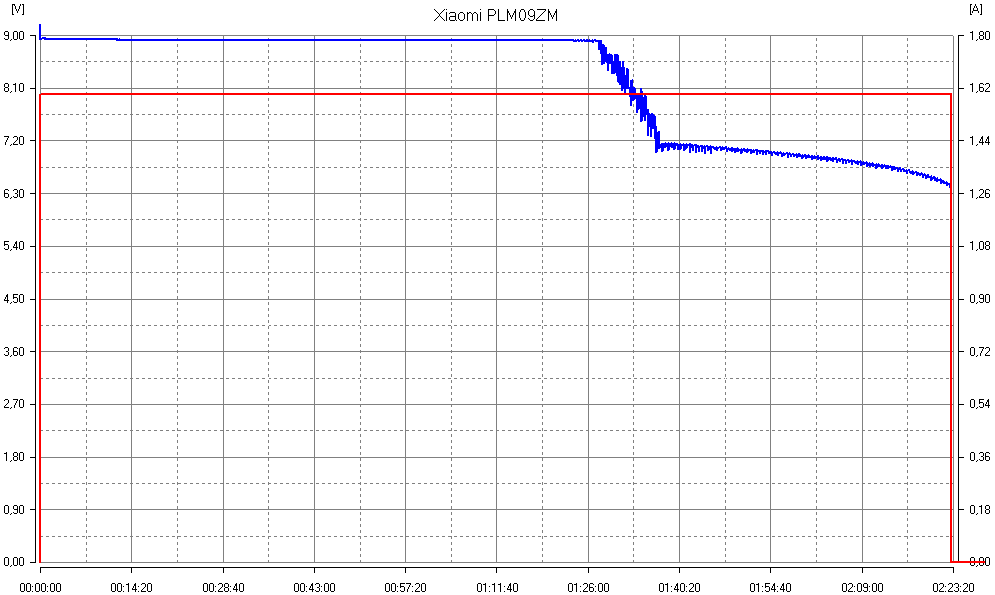 | 9 В / 2,2 А | 8,5 В | незначительно снижается (нагрев на 16-17 градусов) | 8,4 В | 1 час 23 минуты | 25,7 Вт·ч | 70% |