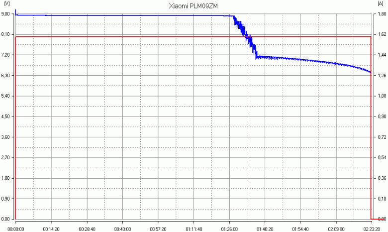 | 1,6 + 1,1 А | 5,0 + 5,1 В | неизменно до отключения (нагрев на 10-11 градусов) | 5,0 + 5,1 В | 2 часа 07 минут | 28,9 Вт·ч | 78% |