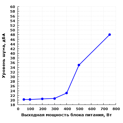 При работе на мощности от 500 Вт уровень шума данной модели приближается к среднетипичному значению при расположении БП в ближнем поле. При более значительном удалении блока питания и размещении его под столом в корпусе с нижним расположением БП такой шум можно будет трактовать как находящийся на уровне ниже среднего. В дневное время суток в жилом помещении источник с подобным уровнем шума будет не слишком заметен, особенно с расстояния в метр и более, и тем более он будет малозаметен в офисном помещении, так как фоновый шум в офисах обычно выше, чем в жилых помещениях. В ночное время суток источник с таким уровнем шума будет хорошо заметен, спать рядом будет затруднительно. Подобный уровень шума можно считать комфортным при работе за компьютером.