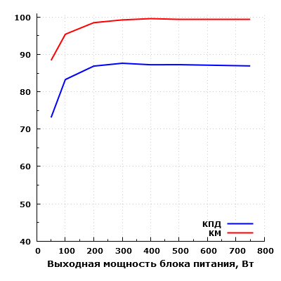 Эффективность БП находится на достойном уровне. Согласно нашим измерениям, КПД данного блока питания достигает значения свыше 86% в диапазоне мощности от 200 до 750 ватт. Максимальное зарегистрированное значение составило 87,6% на мощности 300 Вт. Одновременно с этим, КПД на мощности 50 Вт составил 73,1%.