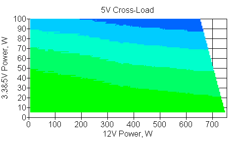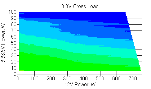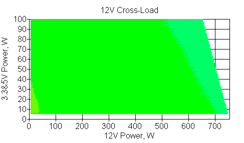 Следующим этапом инструментального тестирования является построение кросснагрузочной характеристики (КНХ) и представление ее на четвертьплоскости, ограниченной максимальной мощностью по шине 3,3&5 В с одной стороны (по оси ординат) и максимальной мощностью по шине 12 В с другой (по оси абсцисс). В каждой точке измеренное значение напряжения обозначается цветовым маркером в зависимости от отклонения от номинального значения.