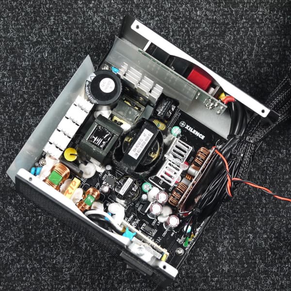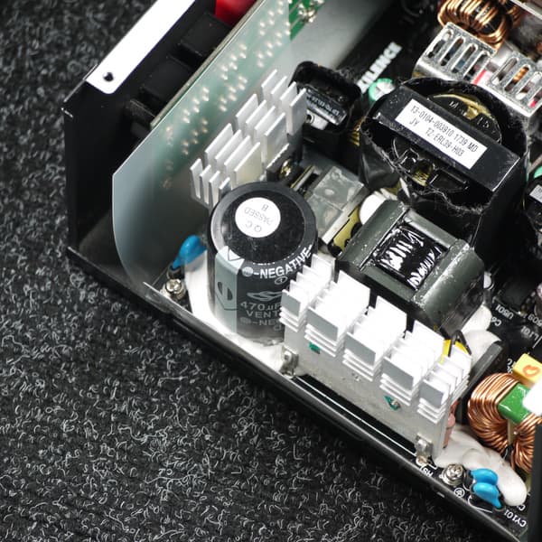 Высоковольтные силовые элементы установлены на двух радиаторах средних размеров, транзисторы синхронного выпрямителя установлены с оборотной стороны основной печатной платы, элементы импульсных преобразователей каналов +3.3VDC и +5VDC размещены на дочерней печатной плате, установленной вертикально (дополнительного теплоотвода там нет).