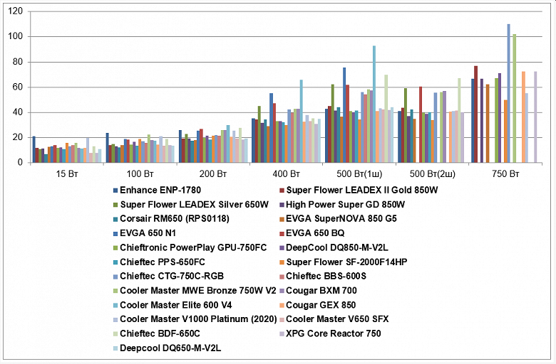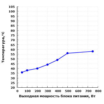 На низкой и средней мощности экономичность высокая, данная модель даже заняла лидирующую позицию по этому показателю среди протестированных нами блоков питания.