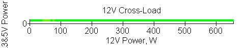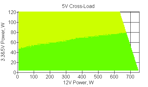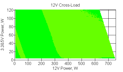 Следующим этапом инструментального тестирования является построение кросснагрузочной характеристики (КНХ) и представление ее на четвертьплоскости, ограниченной максимальной мощностью по шине 3,3&5 В с одной стороны (по оси ординат) и максимальной мощностью по шине 12 В с другой (по оси абсцисс). В каждой точке измеренное значение напряжения обозначается цветовым маркером в зависимости от отклонения от номинального значения.