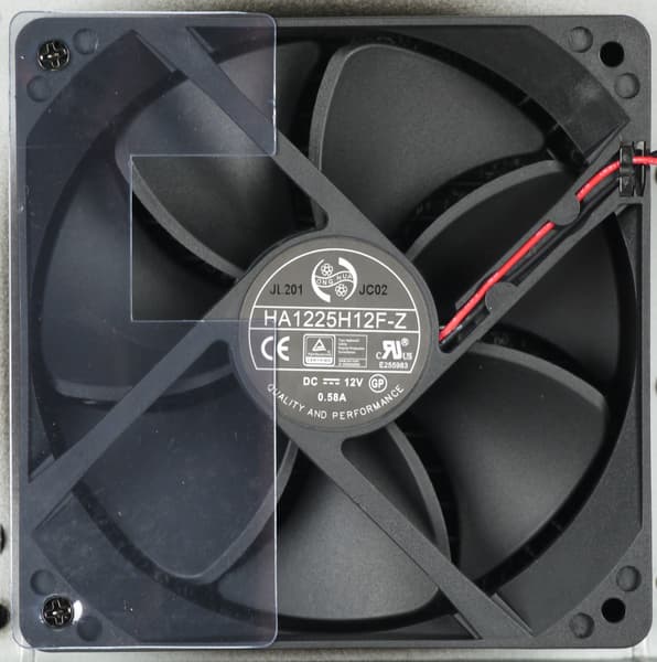 В блоке питания установлен вентилятор HA1225H12F-Z (2200 об/мин), он основан на гидродинамическом подшипнике и изготовлен компанией Dongguan Honghua Electronic Technology. Подключение вентилятора — двухпроводное, через разъем.