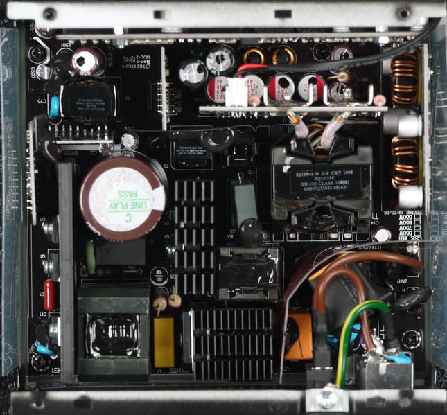 Конструкция блока питания вполне соответствует современным тенденциям: активный корректор коэффициента мощности, синхронный выпрямитель для канала +12VDC, независимые импульсные преобразователи постоянного тока для линий +3.3VDC и +5VDC.