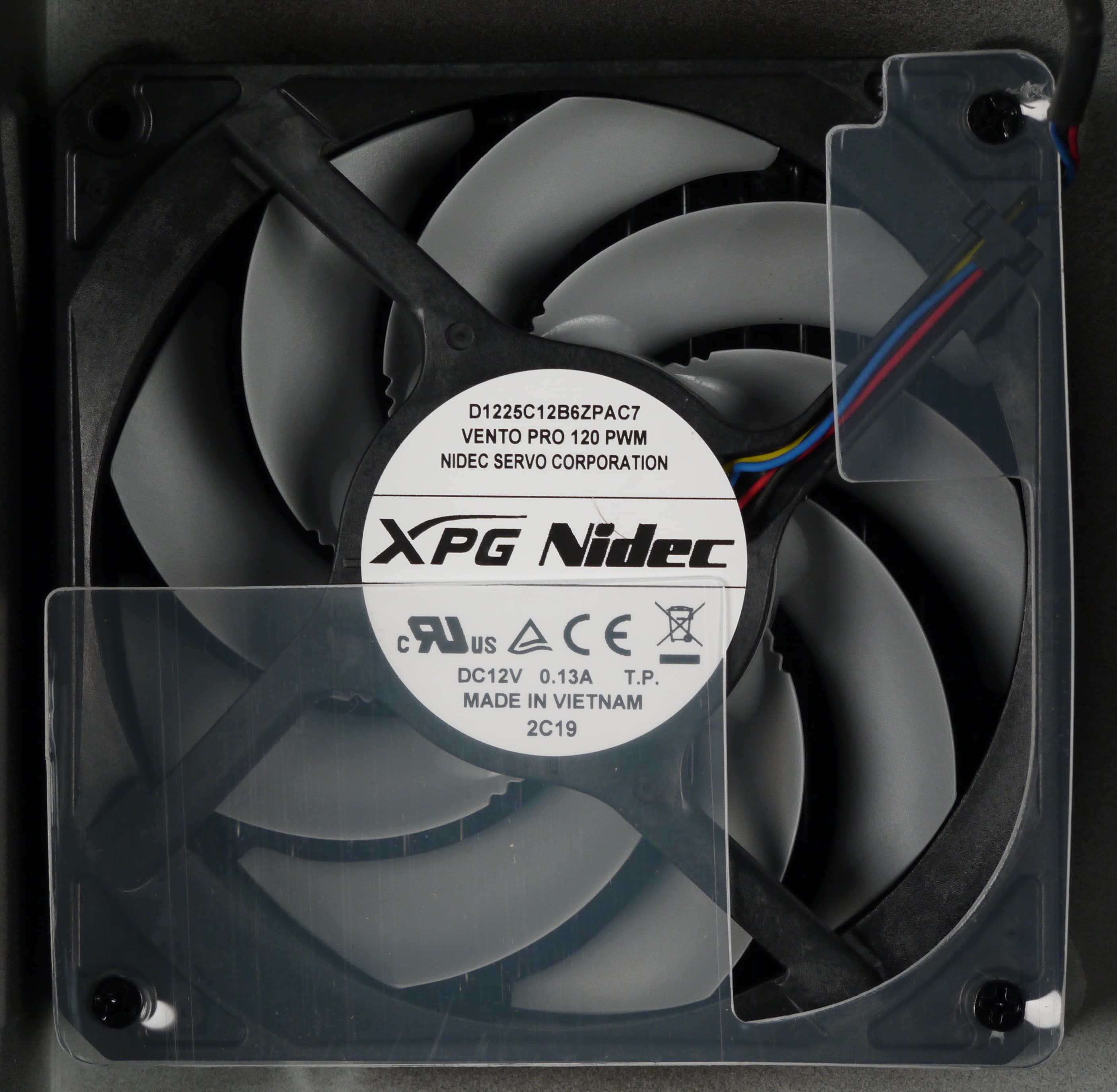 В блоке питания установлен вентилятор XPG Vento Pro 120 PWM, в роли которого выступает модель Nidec (B1225C12B6ZPAC7) типоразмера 120 мм. Подключение 4-проводное, через разъем, что указывает на встроенный в вентилятор ШИМ-контроллер. Произведен вентилятор во Вьетнаме. Он основан на подшипнике качения, что подразумевает очень долгий срок службы.