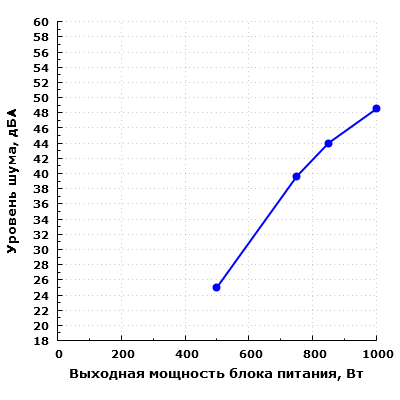 При работе на мощности 750 Вт шум блока питания находится на уровне около 40 дБА с расстояния 0,35 метра. Подобный уровень шума можно считать повышенным для жилого помещения в дневное время суток.