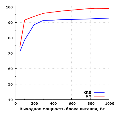 Всего таким образом мы измерили параметры блока питания в 9 точках. В результате максимальный КПД в нашем случае составил 92,85% при выходной мощности 1000 Вт. Максимальная рассеиваемая мощность составила 77 Вт при выходной мощности 1000 Вт, что относительно немного для блока питания подобной мощности.