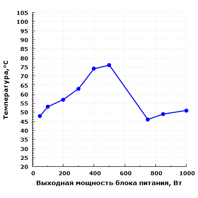 Также стоит учитывать, что в случае работы с остановленным вентилятором температура компонентов внутри БП сильно зависит от окружающей температуры воздуха, и если та установится на уровне 40-45 °C, это приведет к более раннему включению вентилятора.