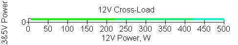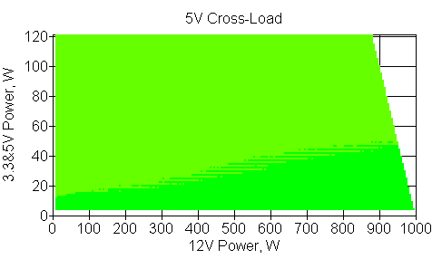 Следующим этапом инструментального тестирования является построение кросснагрузочной характеристики (КНХ) и представление ее на четвертьплоскости, ограниченной максимальной мощностью по шине 3,3&5 В с одной стороны (по оси ординат) и максимальной мощностью по шине 12 В с другой (по оси абсцисс). В каждой точке измеренное значение напряжения обозначается цветовым маркером в зависимости от отклонения от номинального значения.