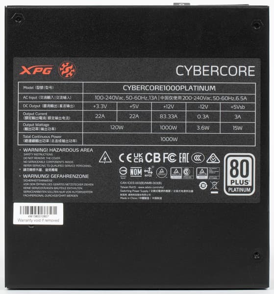 Все необходимые параметры указаны на корпусе блока питания в полном объеме, для мощности шины +12VDC заявлено значение 1000 Вт. Соотношение мощности по шине +12VDC и полной мощности составляет 1, что, разумеется, является отличным показателем.
