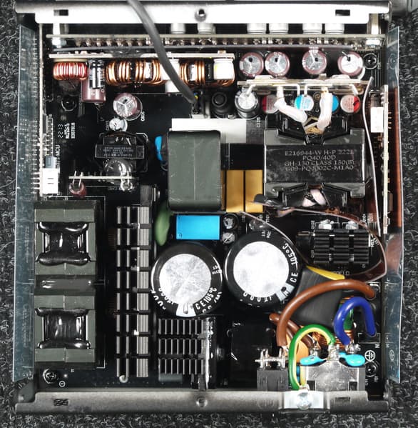 Конструкция блока питания вполне соответствует современным тенденциям: активный корректор коэффициента мощности, синхронный выпрямитель для канала +12VDC, независимые импульсные преобразователи постоянного тока для линий +3.3VDC и +5VDC.