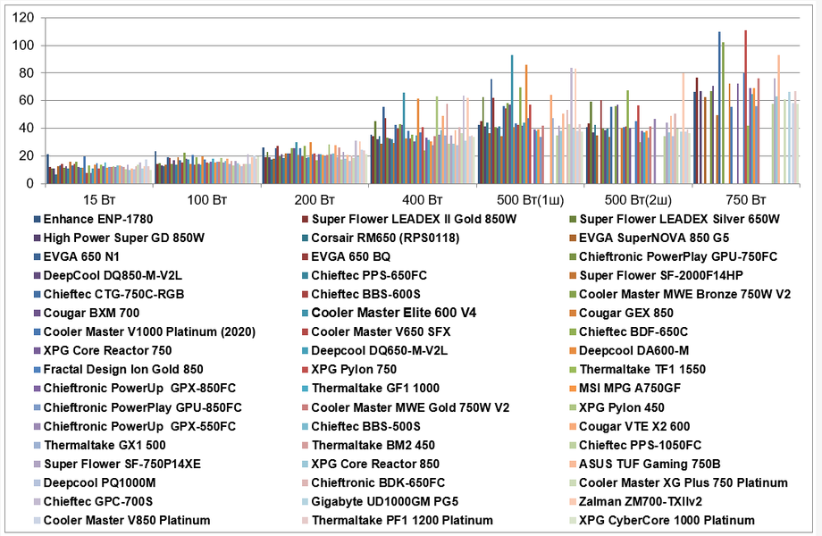 | Super Flower Leadex Silver 650W | 10,9 | 15,1 | 22,8 | 45 | 62,5 | 59,2 | |