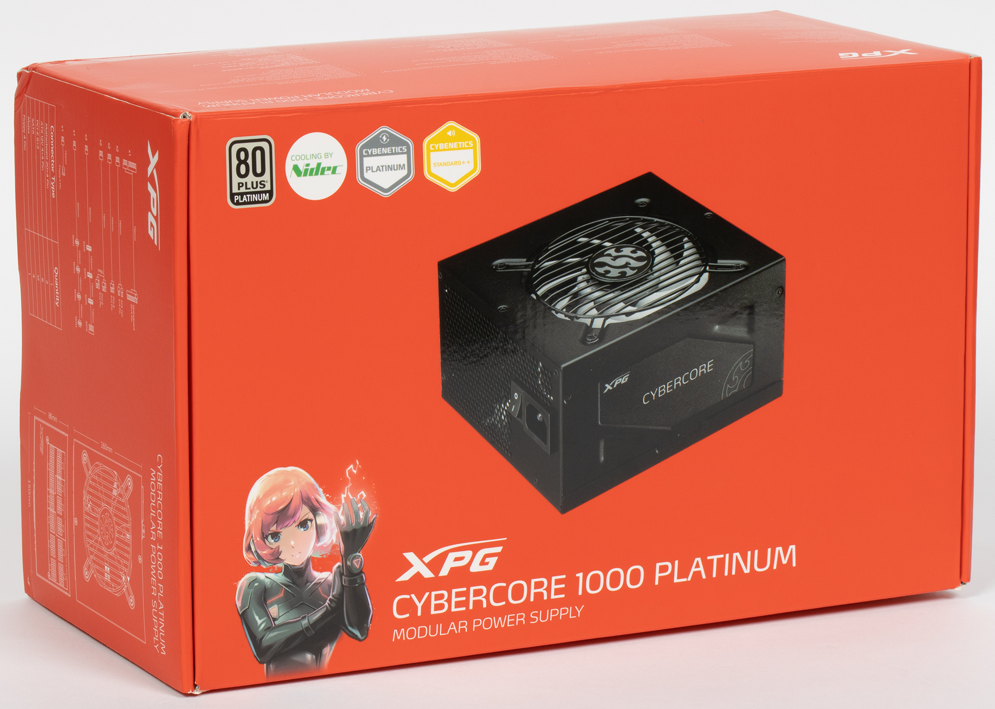 XPG CyberCore 1000 Platinum имеет сертификат 80+ Platinum и укомплектован исключительно японскими конденсаторами. Система охлаждения работает в гибридном режиме, то есть при некоторых условиях вентилятор не вращается.