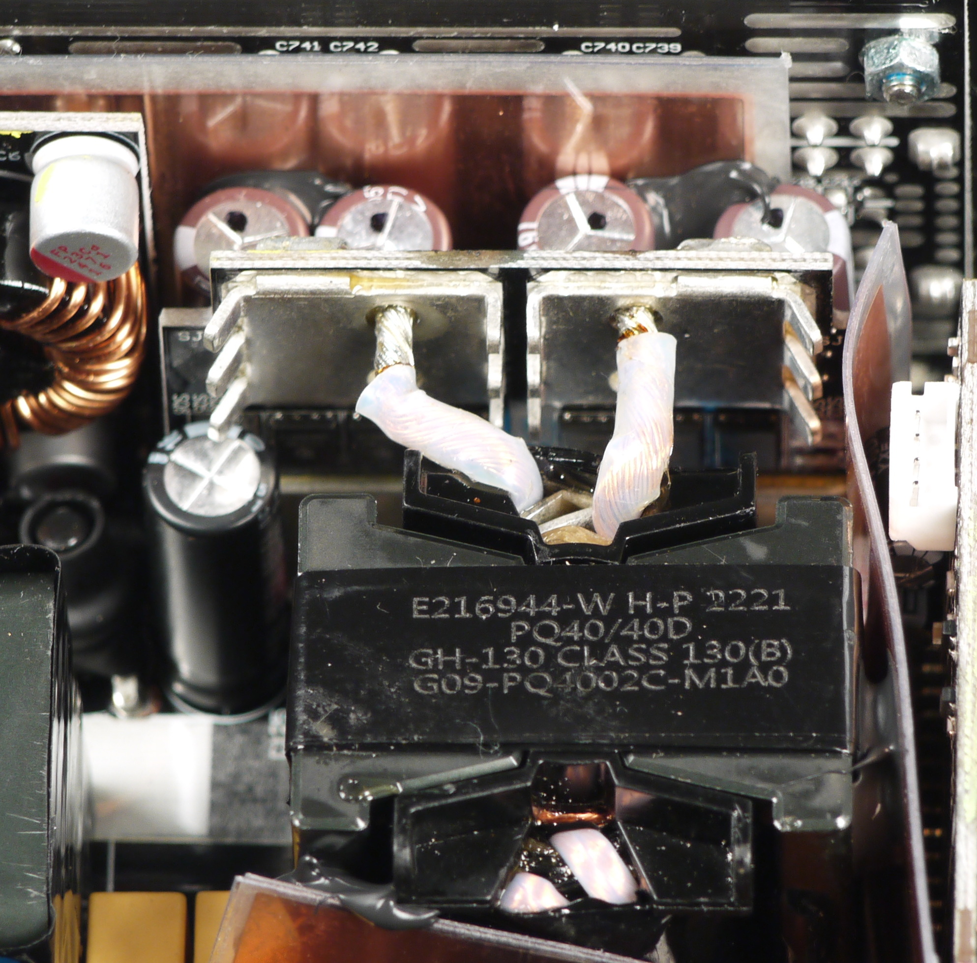 Полупроводниковые элементы высоковольтных цепей размещены на двух радиаторах средних размеров, входной выпрямитель расположен на отдельном теплоотводе. Элементы синхронного выпрямителя размещены на дочерней плате, там же есть небольшие теплорассеивающие элементы в виде тонких пластин. Плата синхронного выпрямителя установлена вертикально, что улучшает охлаждение по сравнению с вариантом размещения элементов синхронного выпрямителя на основной плате методом поверхностного монтажа.