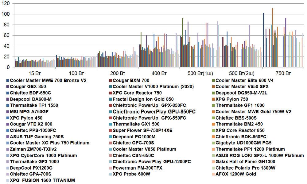 | Cooler Master V1000 Platinum (2020) | 19,8 | 21,0 | 25,5 | 38,0 | 43,5 | 41,0 | 55,3 |