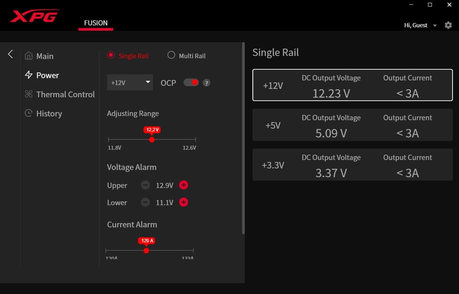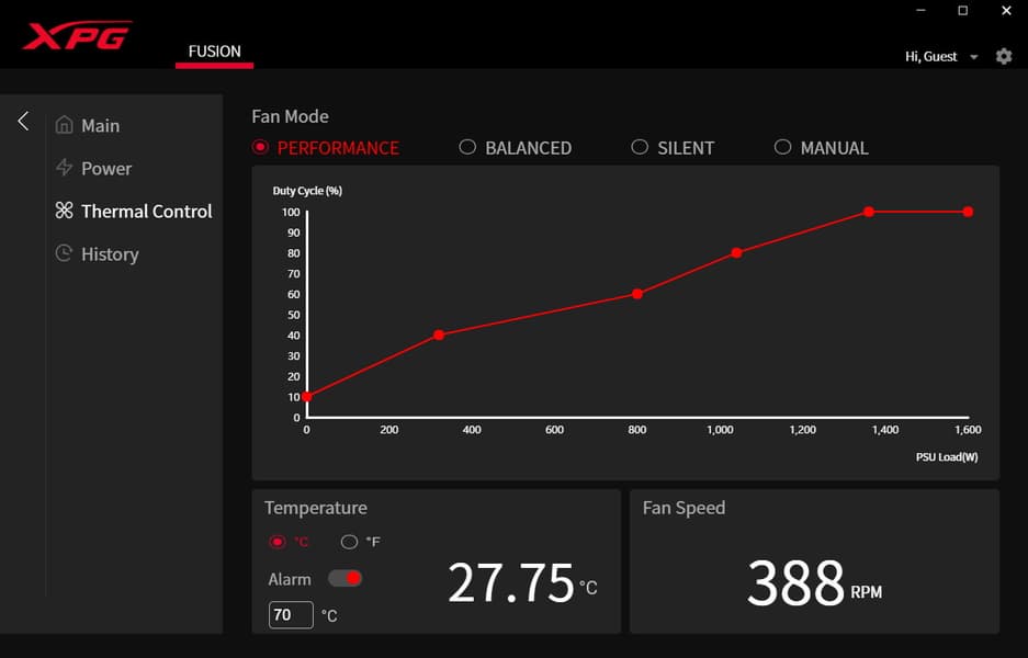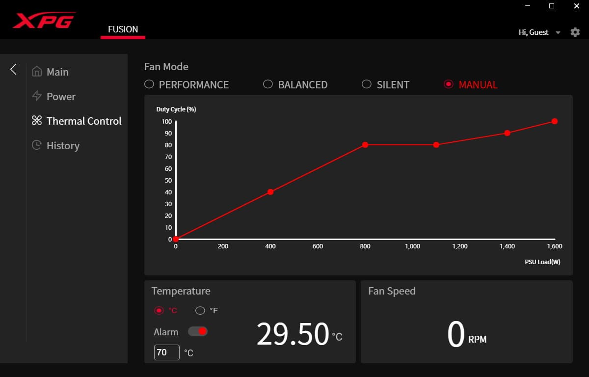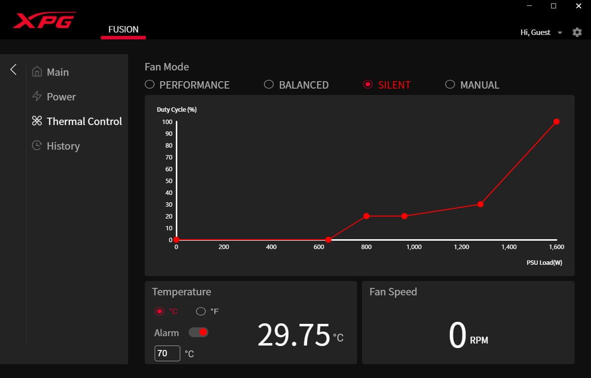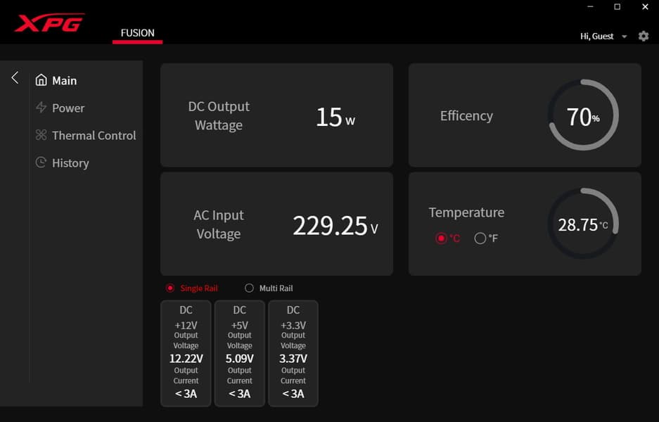 XPG Fusion 1600 Titanium — первый блок питания, который поддерживается программным обеспечением XPG Prime. Вообще данная утилита реализует множество разных функций в случае продуктов XPG, в том числе помогает задавать макросы для кнопок мышек и клавиатур и настраивать режимы подсветки почти всего оборудования бренда. В случае как минимум тестируемой модели БП она позволяет осуществлять не только мониторинг, но и управление рядом параметров. Напомним, что для реализации этого необходимо подключить блок питания фирменным кабелем к внутреннему порту USB на материнской плате.