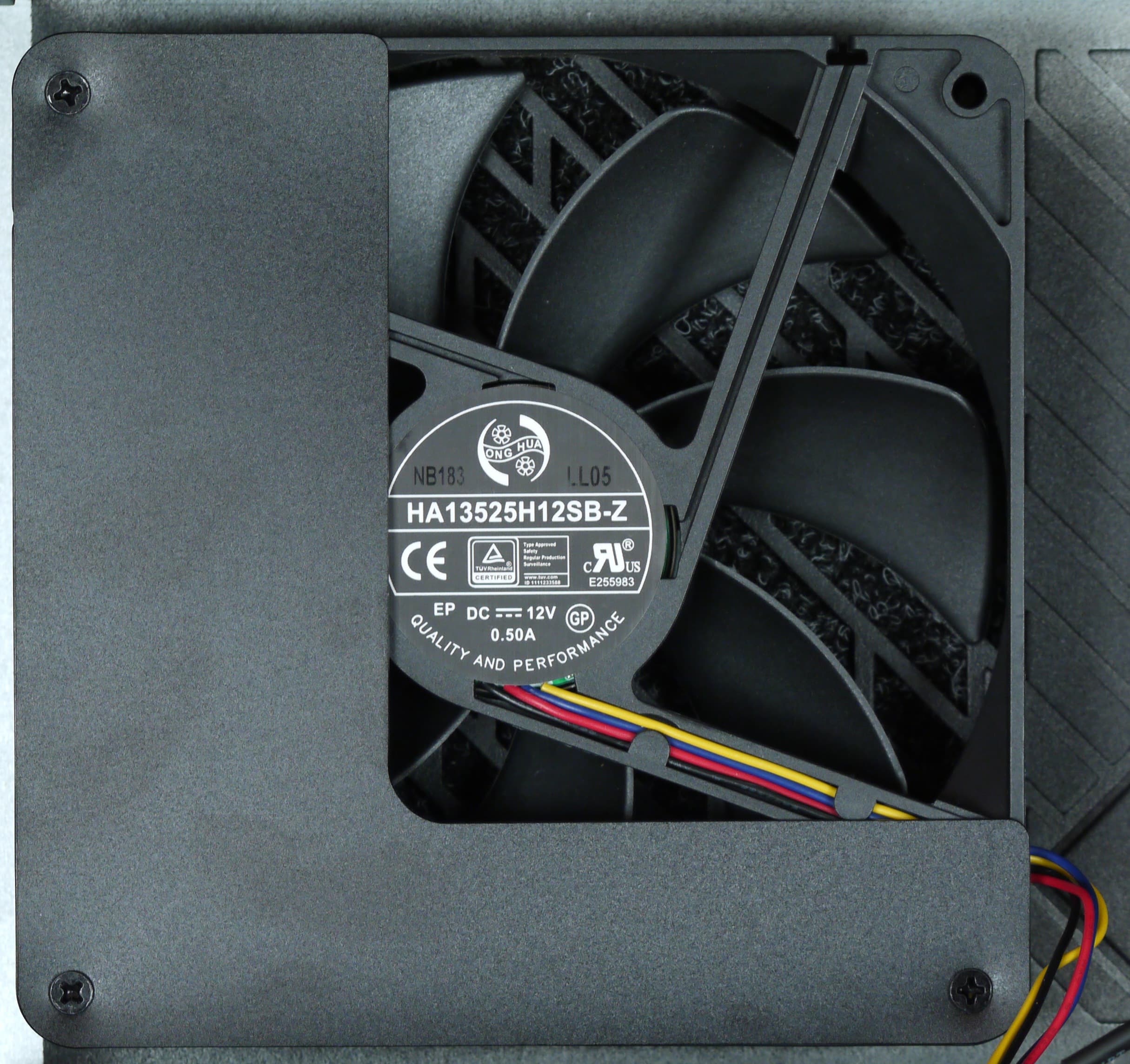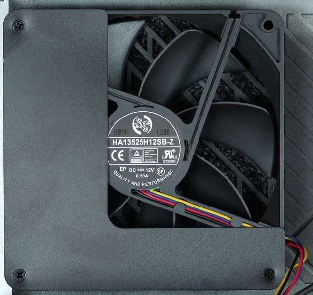 В блоке питания установлен вентилятор HA13525H12SB-Z, основанный на подшипнике качения и изготовленный компанией Dongguan Honghua Electronic Technology. Подключение вентилятора — разъемное, при помощи четырех проводов, что подразумевает использование регулировки частоты вращения с помощью ШИМ и наличие обратной связи в виде сигнала с тахометра. Если вентиляторы с ШИМ-управлением встречаются в БП регулярно, то наличие сигнала с тахометра — это большая редкость.