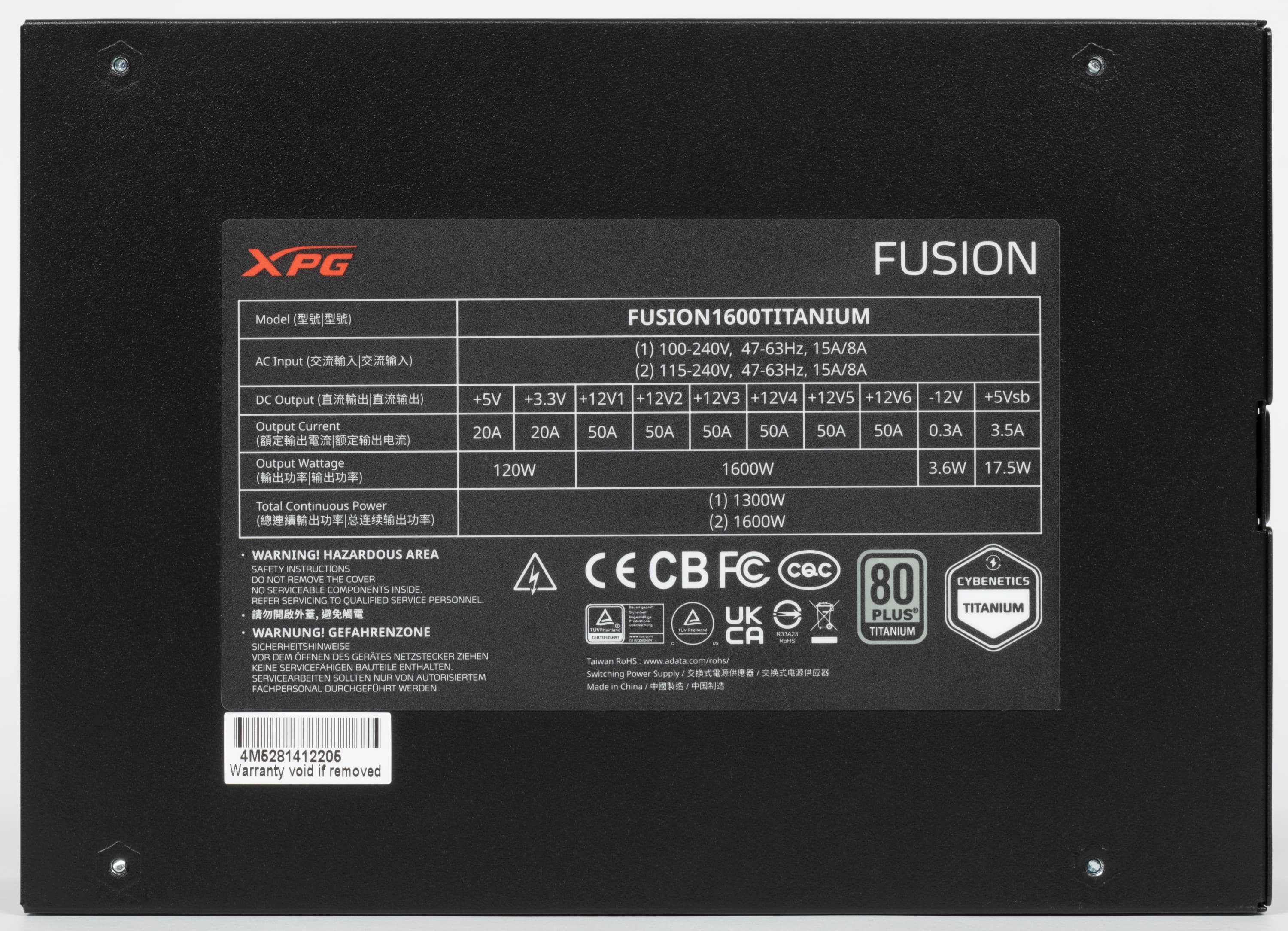 Все необходимые параметры указаны на корпусе блока питания в полном объеме, для мощности шины +12VDC заявлено значение 1600 Вт. Соотношение мощности по шине +12VDC и полной мощности составляет 1,0, что, разумеется, является отличным показателем.