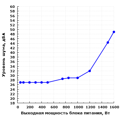 С учетом шума электроники при работе в диапазоне мощности до 500 Вт включительно шум блока питания находится на пониженном уровне — около 27 дБА с расстояния 0,35 метра (вентилятор при этом не вращается).