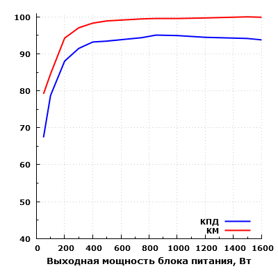 Всего таким образом мы измерили параметры блока питания в 12 точках. В результате максимальный КПД в нашем случае составил около 95% при выходной мощности 850 Вт. Максимальная рассеиваемая мощность составила 106 Вт при выходной мощности 1600 Вт, что совсем немного для блока питания подобной мощности.