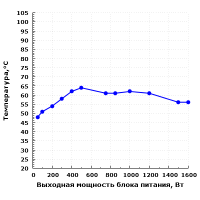 В результате тестирования было установлено, что при типичных для жилого помещения условиях вентилятор в блоке питания включается при наступлении одного из двух событий: при достижении пороговой мощности 800 Вт или пороговой температуры (в нашем случае она составила около 57 градусов), которой блок питания достигает при мощности свыше 500 Вт. При этом на мощности 500 Вт и менее блок питания способен долгое время (2 часа) работать с выключенным вентилятором.