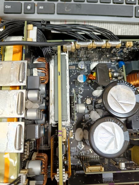 Полупроводниковые элементы высоковольтных цепей размещены на дочерних платах, установленных вертикально. Применен плоский трансформатор, также расположенный вертикально, что сильно экономит место и улучшает воздухообмен.