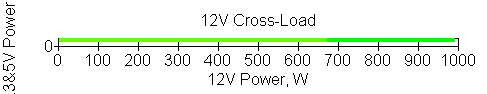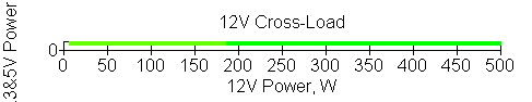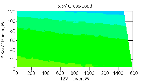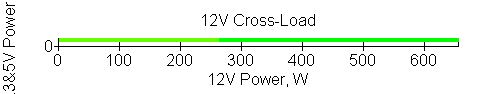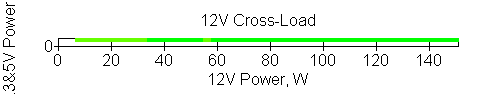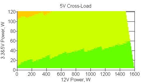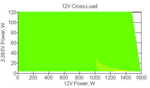 Следующим этапом инструментального тестирования является построение кросснагрузочной характеристики (КНХ) и представление ее на четвертьплоскости, ограниченной максимальной мощностью по шине 3,3&5 В с одной стороны (по оси ординат) и максимальной мощностью по шине 12 В с другой (по оси абсцисс). В каждой точке измеренное значение напряжения обозначается цветовым маркером в зависимости от отклонения от номинального значения.
