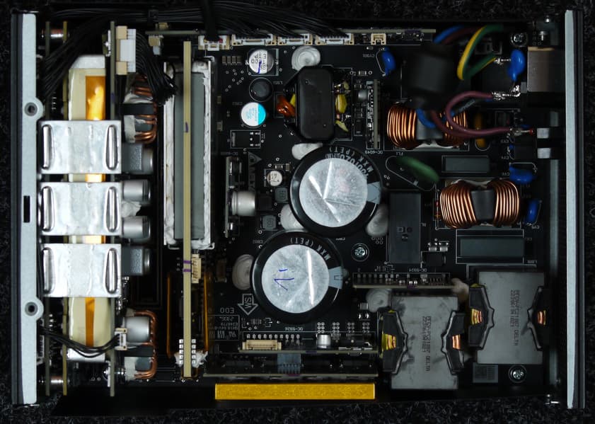 Конструкция блока питания вполне соответствует современным тенденциям: активный корректор коэффициента мощности, синхронный выпрямитель для канала +12VDC, независимые импульсные преобразователи постоянного тока для линий +3.3VDC и +5VDC. Данная модель производится совместно с Delta Electronics, о чем написано как на упаковке, так и на основной плате.