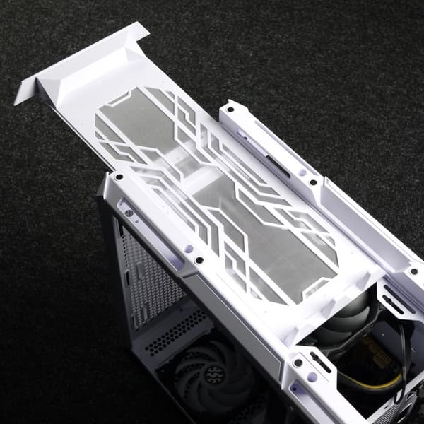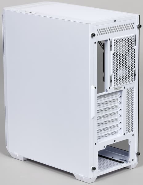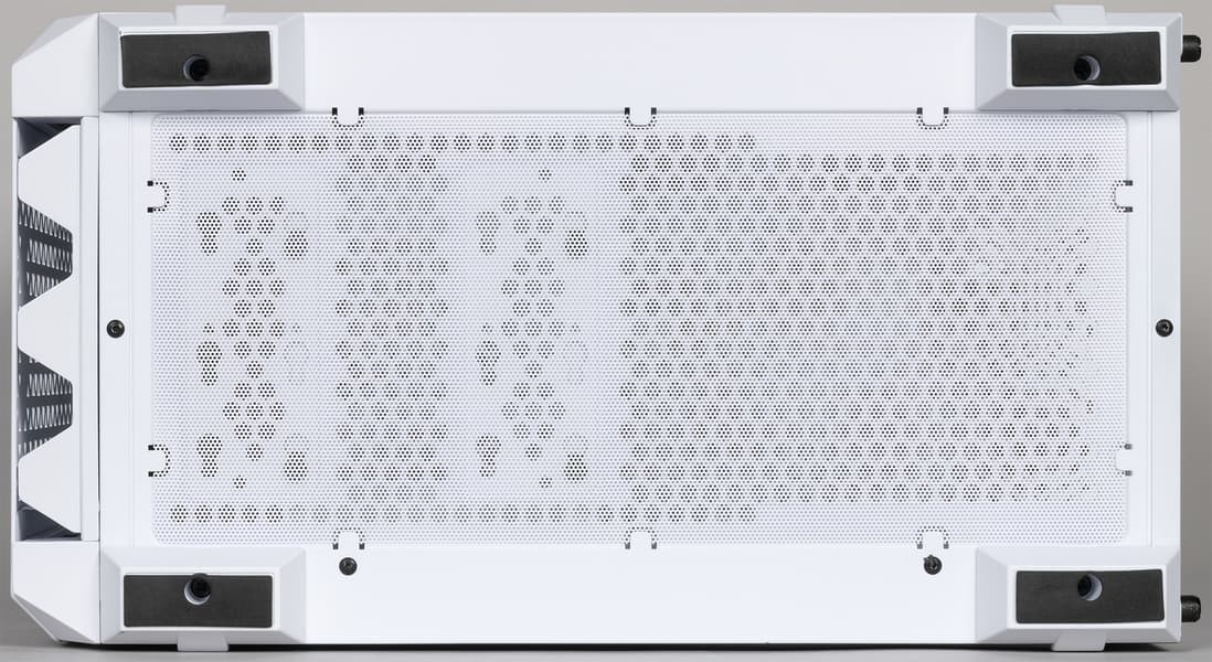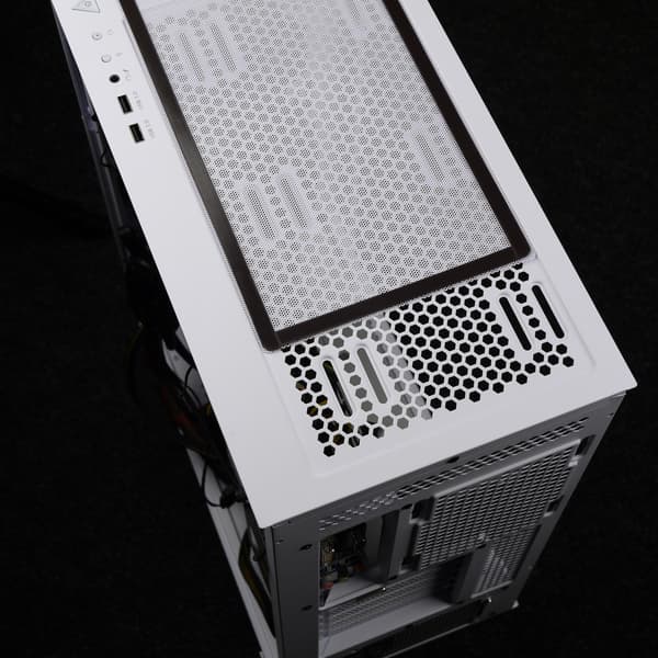 Масса корпуса составляет 7,13 кг, из них 1,88 кг весит стеклянная стенка, 1,11 кг — стальная. То есть если бы обе стенки корпуса были стальными, он весил бы 6,36 кг. Жесткость конструкция не самая высокая, но вполне достойная. Верхняя панель выполнена из стали, имеется большое вентиляционное отверстие, которое закрывает сверху фильтр.