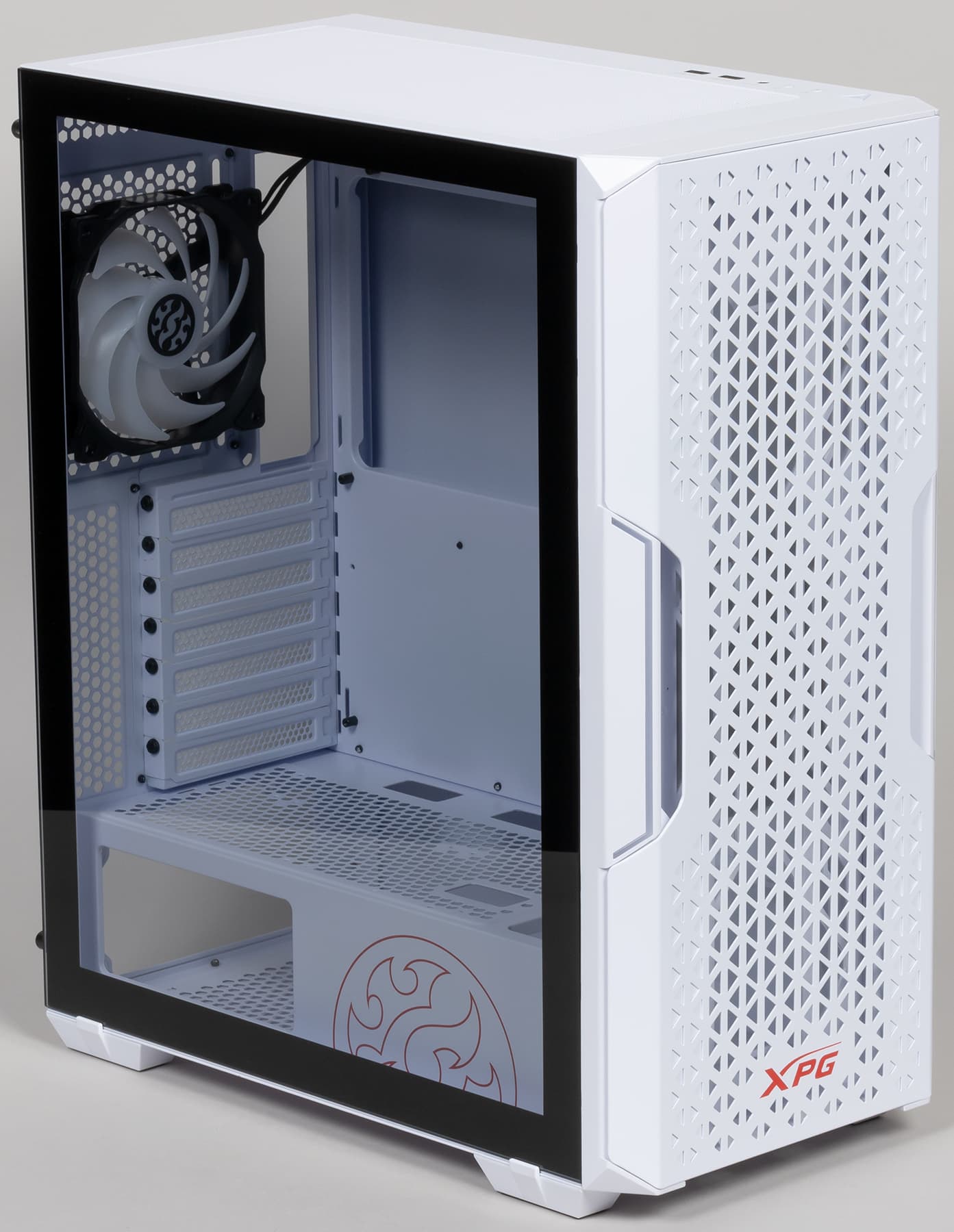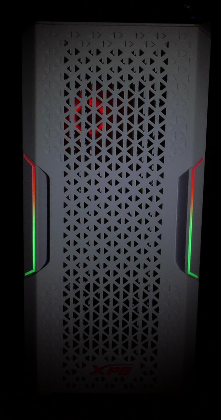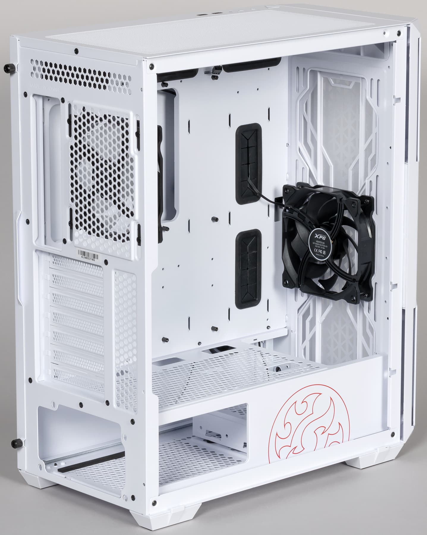 В корпусе предустановлено два вентилятора: один XPG Vento 120 ARGB (1300 об/мин) сзади и один XPG Vento 120 (1300 об/мин) спереди. Оба вентилятора, как следует из их названия, имеют типоразмер 120 мм. Вентиляторы явно не самые дешевые, о чем говорит хотя бы наличие виброизолирующих накладок на их корпусах.