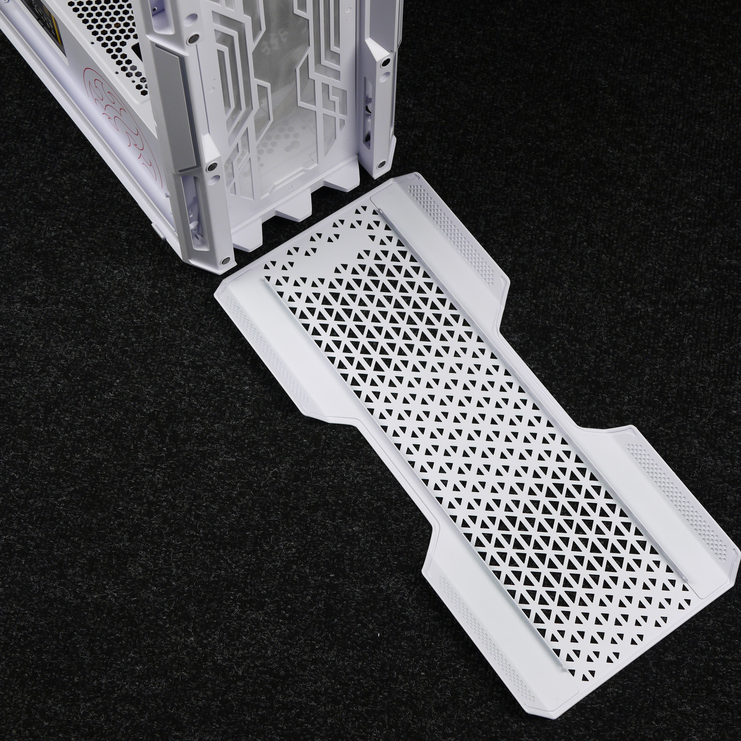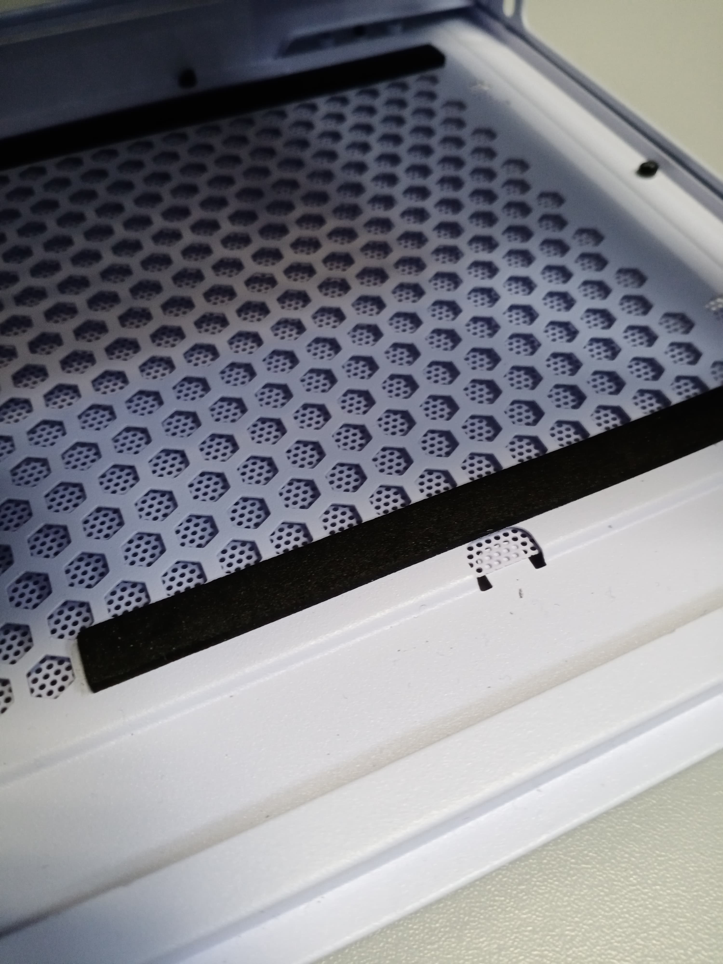 Фильтр для верхней стенки удобнее всего снимается и ставится на место благодаря магнитной окантовке, однако выполнен он из достаточно крупной пластиковой сетки, а потому бо́льшая часть мелких пылинок просочится сквозь него в корпус. С другой стороны, он отлично поможет от падения внутрь корпуса монет, ключей, каких-либо мелких предметов, да и от части пыли тоже спасет.