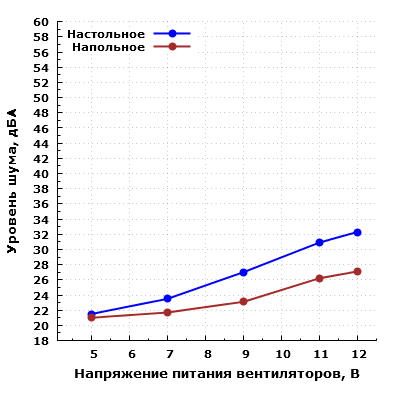 При питании вентиляторов напряжением 5 В шум находится на очень низком уровне даже при расположении микрофона в ближнем поле. Однако с ростом напряжения питания уровень шума возрастает. В типовом диапазоне регулирования напряжения 7—11 В шум изменяется от низкого (23,5 дБА) до пониженного (30,9 дБА) уровня относительно типичных значений для жилых помещений в дневное время суток.