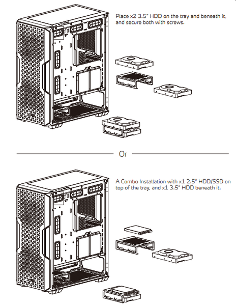 Всего можно установить не более четырех накопителей: от 3×3,5″ до 1×3,5″ и 3×2,5″. Этого вполне достаточно для типичного домашнего компьютера, хотя для рабочей системы может оказаться маловато.
