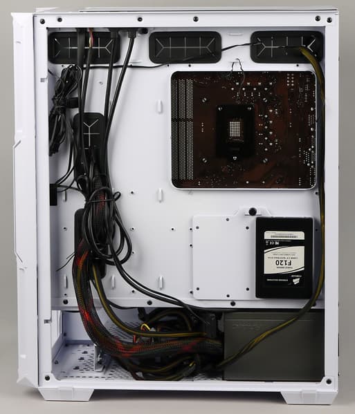 Компоновочные решения данной модели определяются современными тенденциями корпусостроения. В данном случае разработчики отказались от отсека для устройств формата 5,25″, а привычный отсек для устройств 3,5″ расположен около передней стенки шасси, но присутствует он в усеченном виде — всего на два диска. При желании его можно снять или передвинуть, открутив винты.