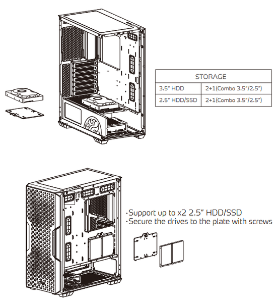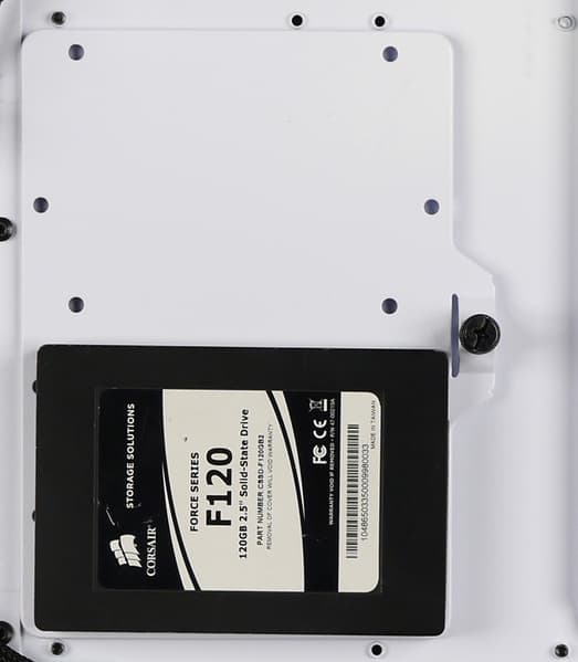 Для накопителей формата 2,5″ предусмотрены два посадочных места, которые размещены на обратной стороне основания для системной платы. Фиксируются диски на одной монтажной пластине, которая является универсальной. Также на нее можно установить один накопитель типоразмера 3,5″, еще есть возможность переставить данную пластину на кожух блока питания.