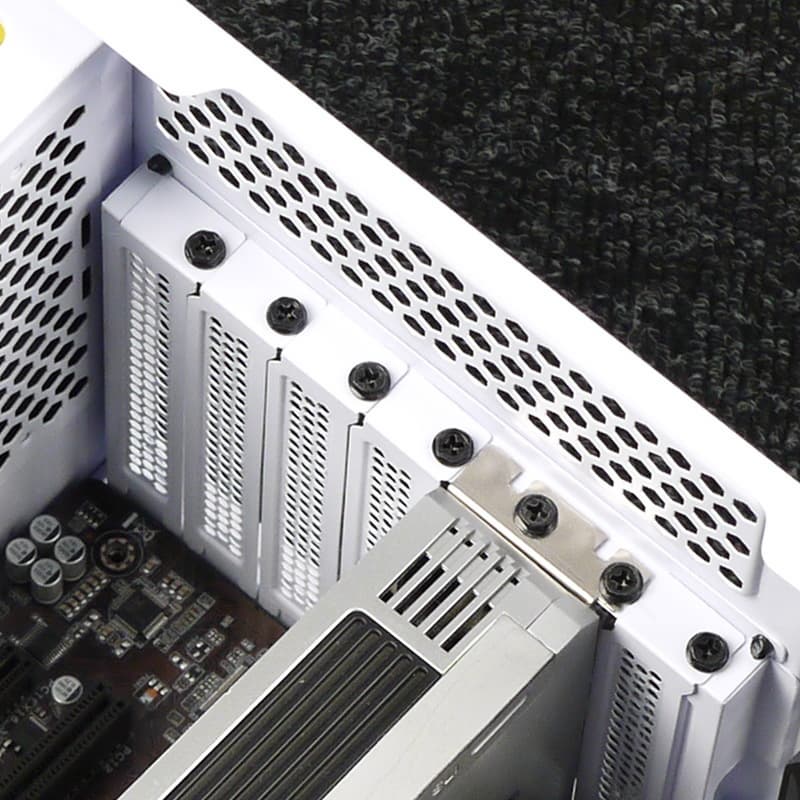 Система фиксации карт расширения самая обычная — крепление на винтах изнутри корпуса с индивидуальной фиксацией. Все заглушки для плат расширения съемные, фиксируются одним винтом с накатной головкой. Предусмотрена возможность установить видеокарту параллельно системной плате, для этого придется заменить монтажную панель для плат расширения (нужная деталь есть в комплекте поставки).