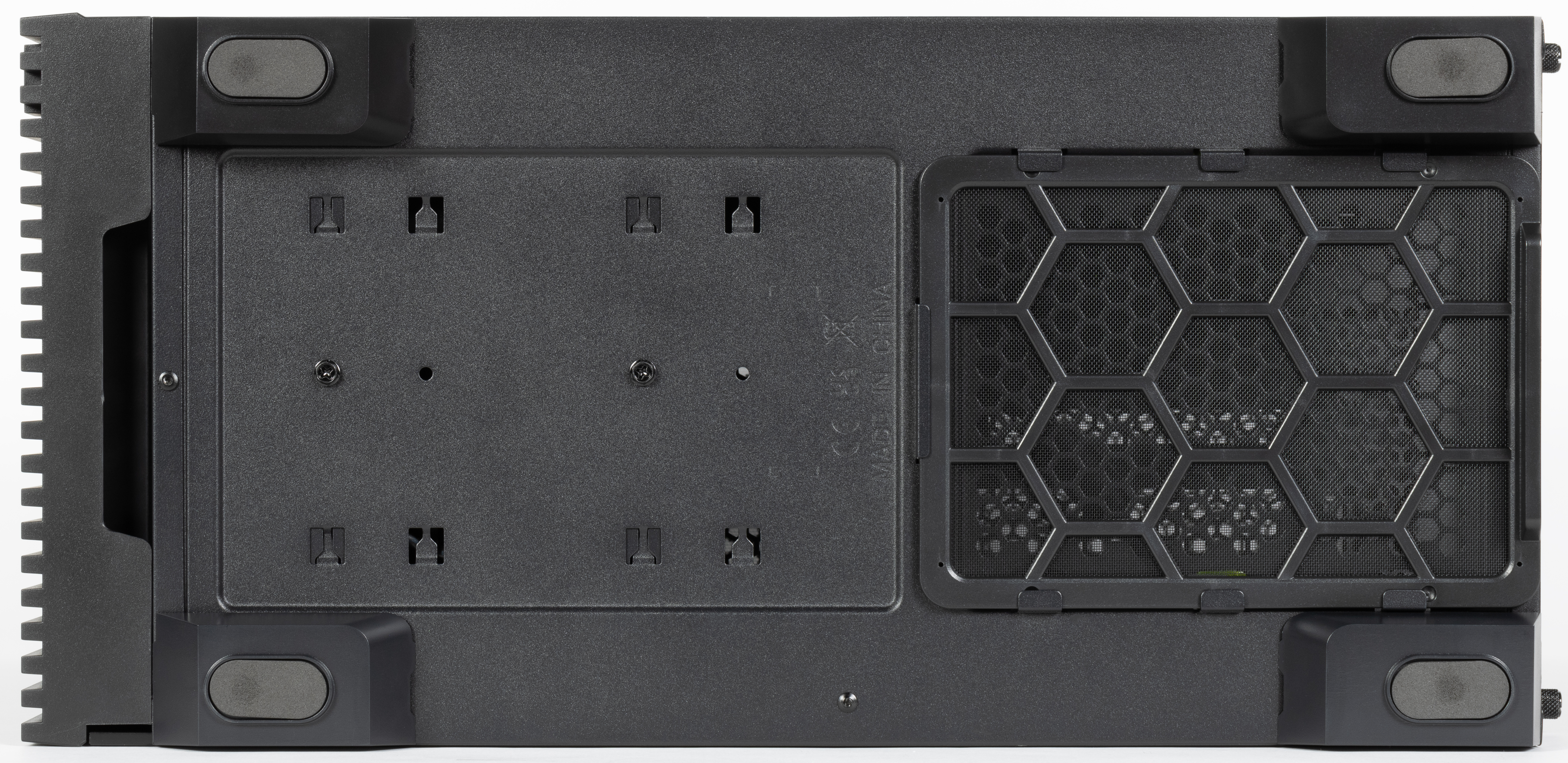 По высоте корпус разбит на два объема, которые разделяются перегородкой с отверстиями, вентиляционными и для кабелей, закрывающей место установки блока питания и со стороны прозрачной стенки. В верхнем вертикально размещается системная плата форматом до ATX включительно с платами расширения, в нижнем горизонтально устанавливается блок питания и имеется корзина для 3,5/2,5-дюймовых накопителей. А для установки 2,5-дюймовых HDD/SSD есть дополнительные крепления на оборотной стороне основания для системной платы. Посадочные места для накопителей с внешним доступом в корпусе отсутствуют.