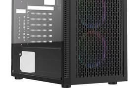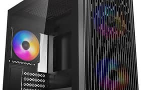 Корпус Deepcool Matrexx 40 3FS, безусловно, является представителем бюджетного сегмента, но с большим желанием влезть в игровой сегмент. Ради этого в нем установлены три вентилятора с подсветкой — правда, вентиляторы нерегулируемые, а подсветка неуправляемая. Корпус относительно короткий и вообще компактный, он рассчитан на материнские платы формата microATX, но видеокарту в него можно установить почти любую.