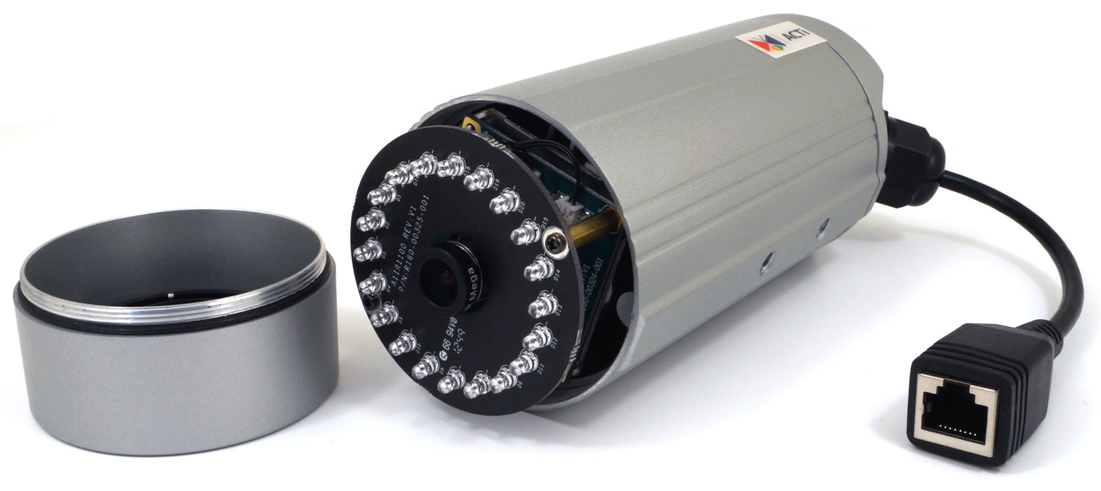Крышка объектива привинчивается непосредственно к корпусу, имеющему нужную резьбу. Резиновая прокладка по периметру крышки герметизирует камеру. Объектив расположен на печатной плате, вынесенной из корпуса чуть вперед. По периметру платы расположены двадцать инфракрасных светодиодов, об их эффективности мы расскажем ниже. Объектив камеры легко поворачивается пальцами, но для более точной настройки фокусировки лучше использовать прилагаемую насадку с отверстием.